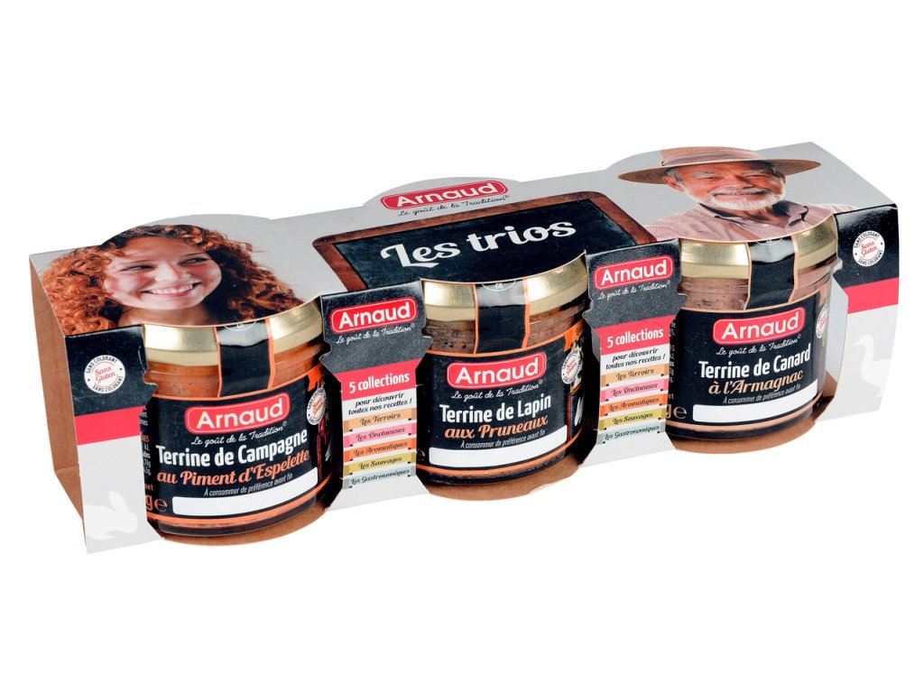 - Farmářské trio terin (hrubozrnných paštik) "Arnaud" (FARM.TERINA S PÁL. PAPR. ESPELETTE, KRÁLIČÍ TERINA SE ŠVESTKAMI, KACHNÍ TERINA S ARMAGNACEM)
