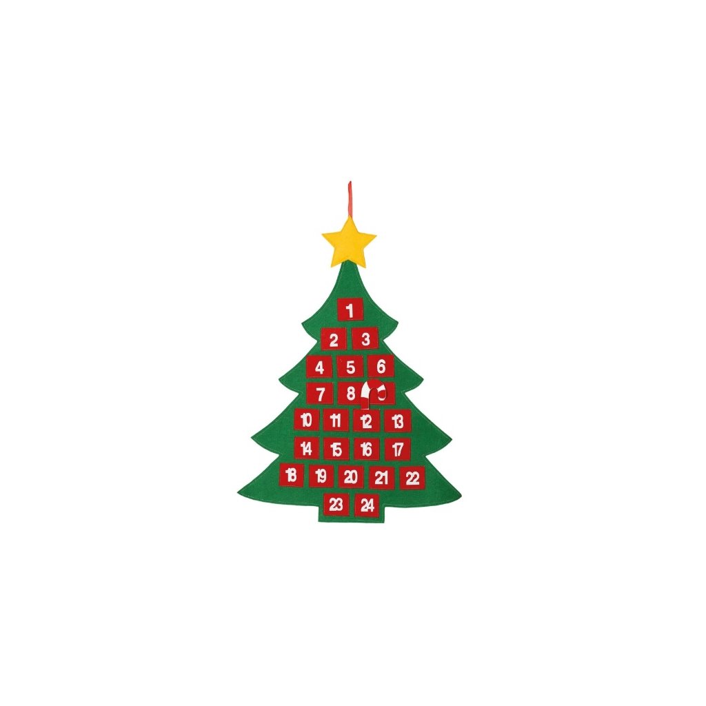 Adventní kalendář s cukrkandlovým lízátkem který pomalu odpočítává čas do Vánoc. Kalendář ve tvaru Vánočního stromečku opatřený kapsami na drobná cukrátka, nebo filcové lízátko. Krásně vyzdobí dětský pokojíček i kancelář. Balení: sada kalendář + filcové lízátko. Rozměry: 55x70 cmMateriál: Filcová látkaDoplňkové parametry