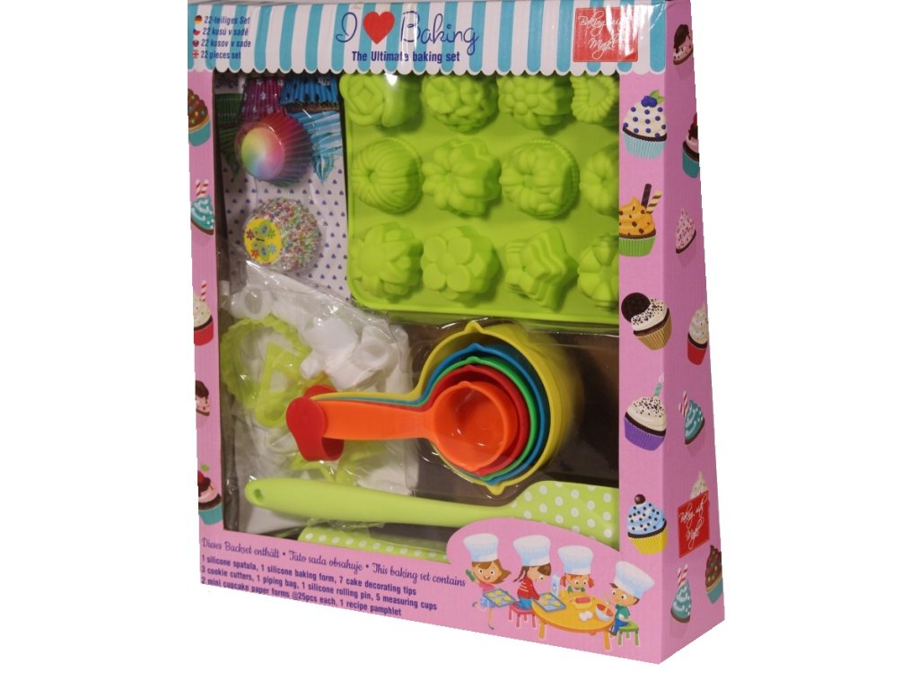Tato sada obsahuje: 1 silikonová stěrka, 1 silikonová pečicí forma, 7 plastových trezírovacích špiček, 3 plastová vykrajovátka, 1 trezírovací sáček, 1 silikonový váleček, 5 plastových odměrek, 2 x 25 ks papírových košíčků na mini muffiny a 1 brožura s receptemDoplňkové parametry