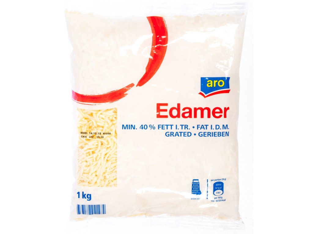 - Edam strouhaný, sýr. Tuk v sušině 40 %. Obsah sušiny min. 53 %. Baleno v ochranné atmosféře.