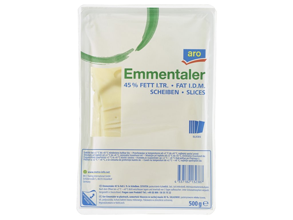 Oblíbený produkt z kategorie: . aro Emmentaler 45% plátky 500 g máme běžně skladem.