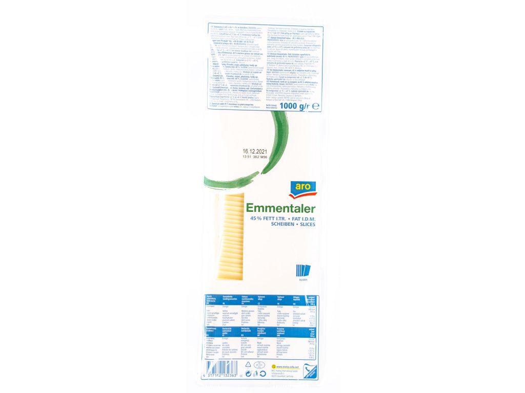 NUTRIČNÍ HODNOTY produktu - aro Emmentaler 45 % plátky 1 kg / 100g výrobku