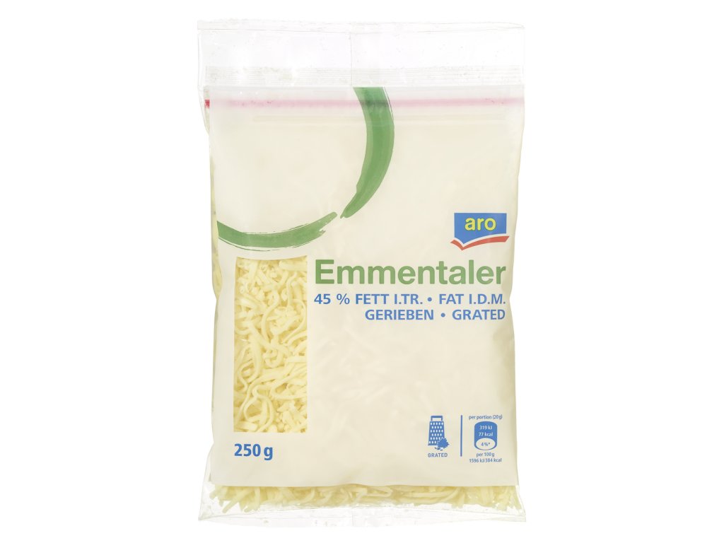 - Emmental strouhaný, sýr, 45 % tuku v sušině. Obsah sušiny min. 60 %. Baleno v ochranné atmosféře.