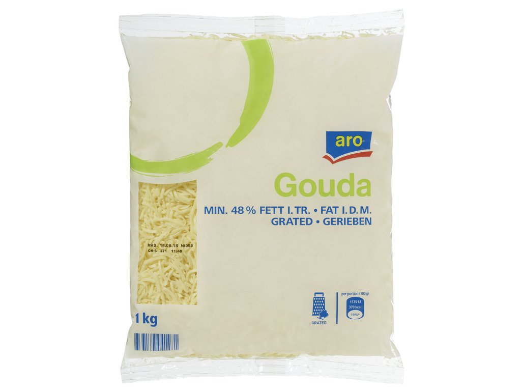 - Gouda strouhaná, sýr. Tuk v sušině 48 %. Obsah sušiny min. 56 %. Baleno v ochranné atmosféře.