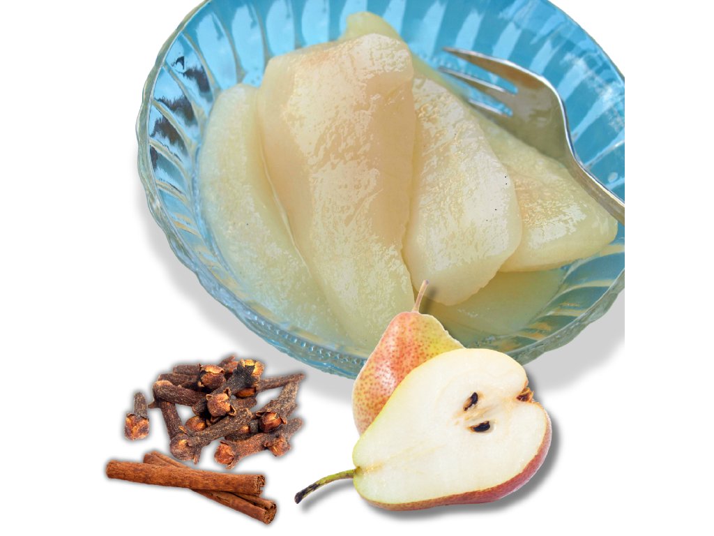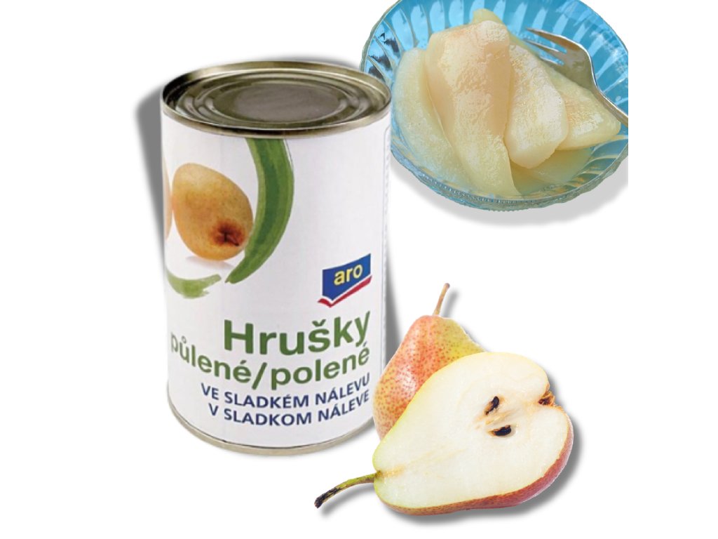 - Hrušky půlené ve sladkém nálevu. Konzervované pasterované ovoce.
