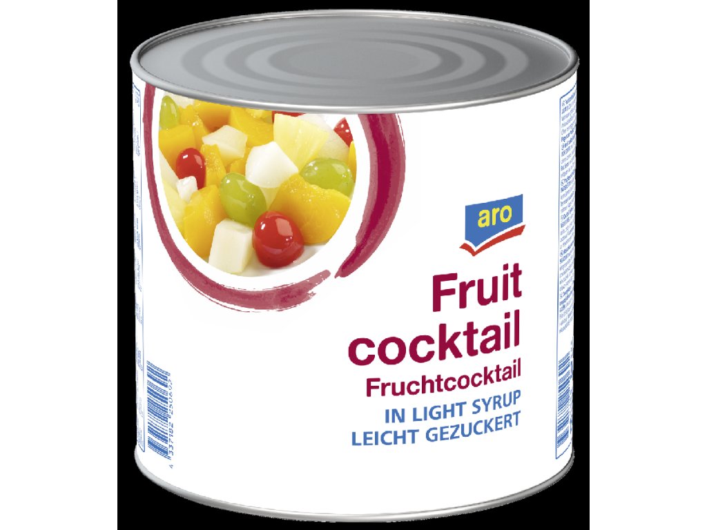 - Směs ovoce v proměnlivém poměru [hruška, broskev, ananas, hroznové víno, třešně (barvivo: erythrosin)], voda, cukr, regulátor kyselosti: kyselina citronová; antioxidant: kyselina askorbová.