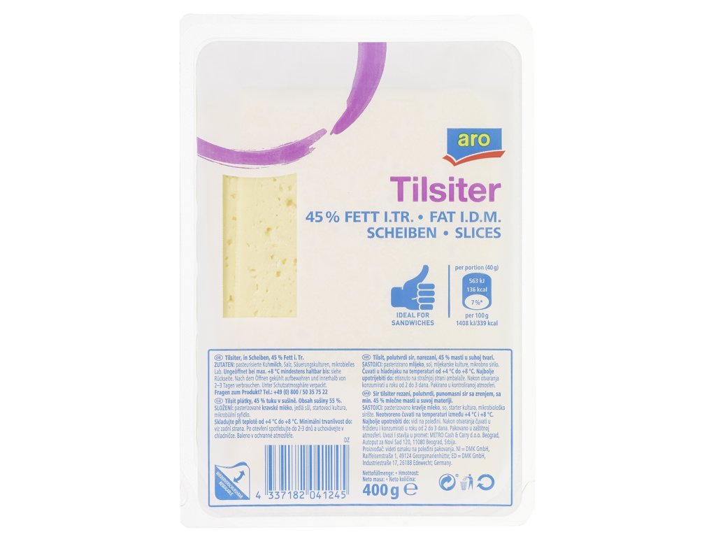 Oblíbený produkt z kategorie: . aro Tilsiter sýr 45% plátky chlaz. 400 g máme běžně skladem.