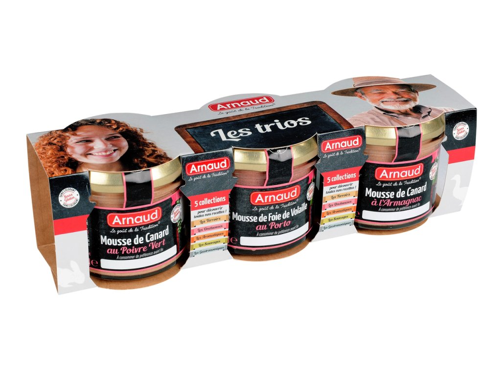 Kuřecí játra 50%, vepřové maso, MLÉKO, vejce, sůl, portské víno 1%, koření, přírodní aroma. Vepřové sádlo, kachní libové játra 20%, voda, kuřecí játra, kachní sádlo, vejce, modifikovaný škrob, Armagnac 1%, sůl, konzervant: dusitanová sůl, mléčné bílkoviny, přírodní aroma. Vepřové sádlo, kachní libové, játra 20%, voda kuřecí játra, husí sádlo, vejce, modifikovaný škrob, koňak, zelený pepř 0,9%, sůl, konzervant: dusitanová sůl, mléčné bílkoviny, přírodní aroma.