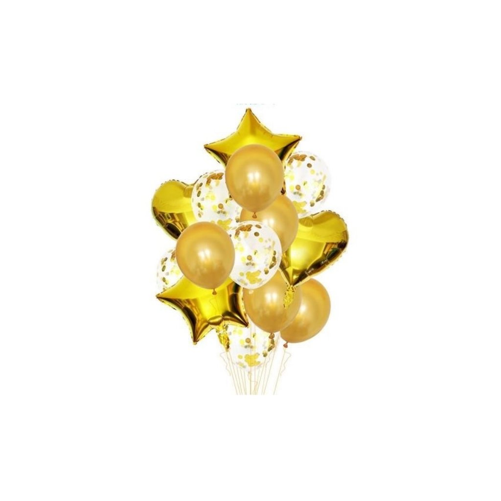 Sada prémiových latexových a fóliových balonků. Balení obsahuje 2 kusy foliových zlatých srdcí, 2 kusy foliových zlatých hvězdiček o průměru 45 cm, 10 kusů latexových balonků o průměru 30 cm a balení konfet. Balonky jsou vhodné na nafouknutí heliem i vzduchem. Buket se hodí na narozeninové oslavy, firemní večírky, na Silvestra, Vánoce i na jiné příležitosti. Barva: ZlatáObsah balení: 2 x zlaté foliové srdce, 2x zlatá foliová hvězda, 5 x metalický zlatý latexový balonek, 5 x transparentní balonek, 1 x 15 g balení zlatých konfetObjem celého buketu: cca 220 lObjem 1 ks balonku (folie i latex): cca15 lNafukování: vzduch nebo héliumVýdrž hélia v foliovém balónku: 2 - 5 dníVýdrž hélia v latexovém balónku bez ošetření gelem: 14 hod.Výdrž hélia v latexovém balónku po ošetření gelem: cca 3 dnyMateriál: Latex, kovová folieObchodní balení: AnoBalení: 1 ksDoplňkové parametry