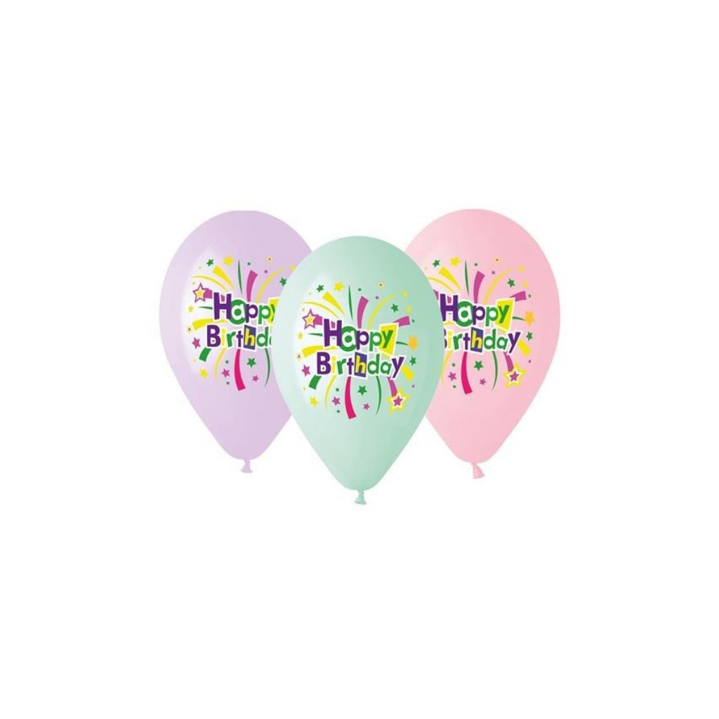 Latexové balonky Happy Birthday 33 cm - pastelové, které vám pomohou vyzdobit a doladit narozeninovou party. Balonky jsou vhodné pro plnění vzduchem i héliem. Barva: Mix Velikost: 33 cm. Balení: 5ks.Doplňkové parametry