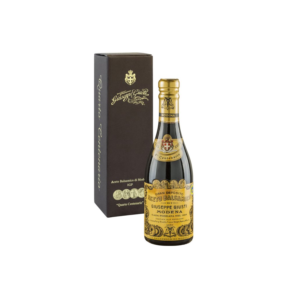 Ocet Balsamico di Modena Quarto centenario, 4 medaglie d oro - má vyváženou sladkokyselou chuť, s tóny zralého ovoce, tabáku a kávy s Balsamickou příchutí, typickou Balsamica di Modena. Je ideální k těstovinám s masovou omáčkou, tvrdým sýrům s výraznou chutí, polentě s houbami a grilovanému masu. Zraje 12 let v dubových sudech s příměsí balsamica vyzrálého ve stoletých bečkách.