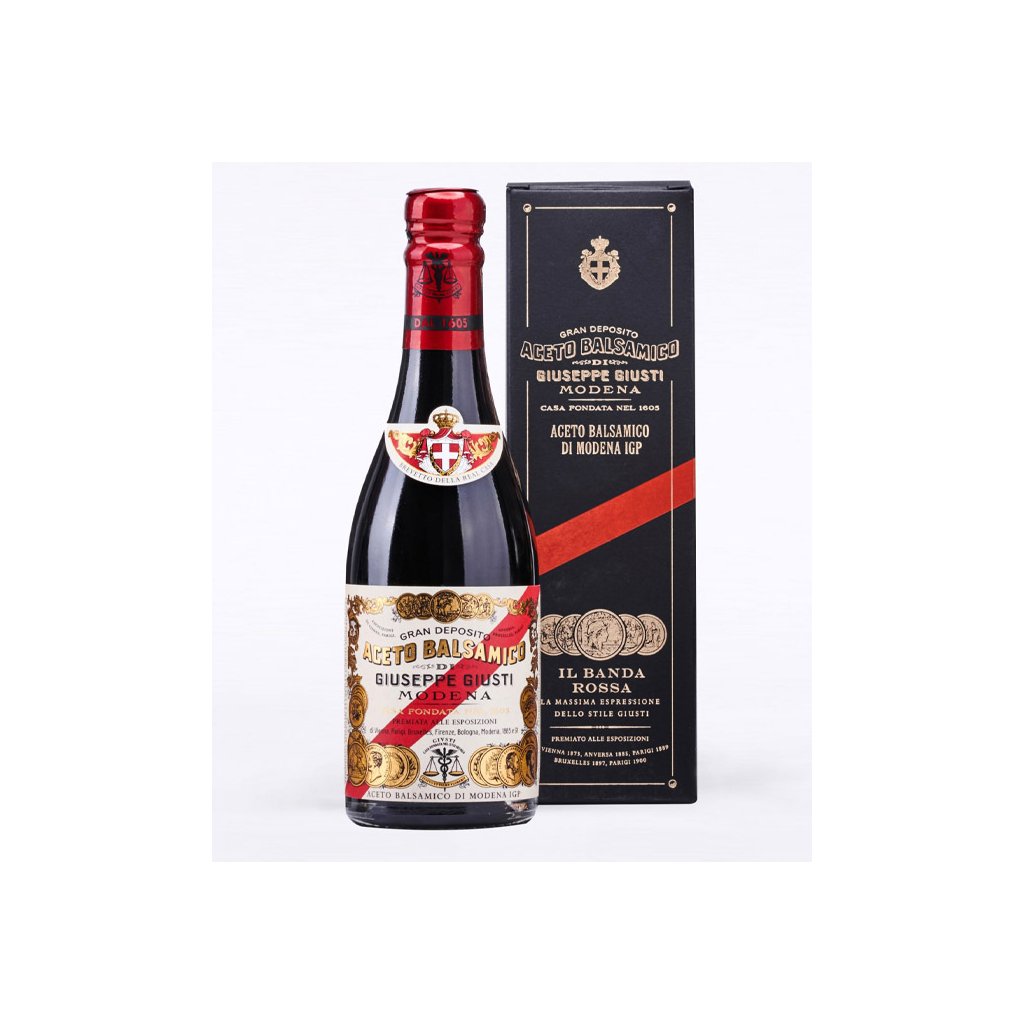 Balsamikový ocet z Modeny IGP, 5 zlatých medajlí Giusti - Banda Rossa je chloubou octářského umění rodiny Giusti a je to osobní dárek strýce Giuseppe ostatním členům rodiny. Je velmi hustý a silný s nezaměnitelným, bohatým aroma. Mezi jinými rozeznáme tony švestek, černých třešní, se sladkou kořeněnou příchutí dodávanou starým dřevem beček ve kterých zraje a která zůstává na jazyku dlouhou dobu. Zraje 20 let ve starých sudech původem ze 17. a 18. století. Stáčí se jednou ročně v omezeném množství.