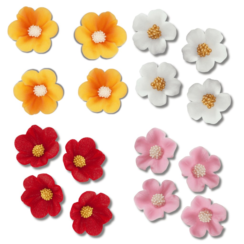 Cukrová dekorace v podobě sady květin. Skvěle se hodí ke zdobení narozeninových a svatebních dortů.
