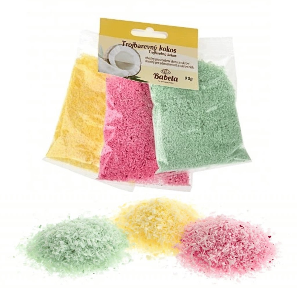Strouhaný barevný kokos ve třech barvách po 30g. Cena je za celé balení - tj.3x30g.