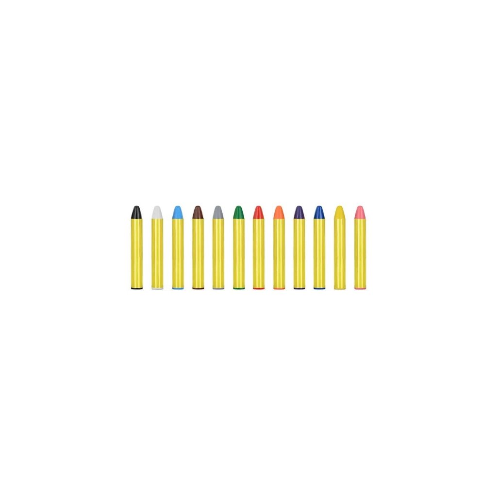 Tužky na obličej v různých barvách. Ideální pro rychlé malování na obličej. V balení jsou barvy: černá, bílá, červená, žlutá, tmavě zelená, modrá, světle modrá, oranžová, růžová, fialová, hnědá, šedá. Barvy jsou vyrobeny na tukové bázy. Balení: 12 ks.Doplňkové parametry