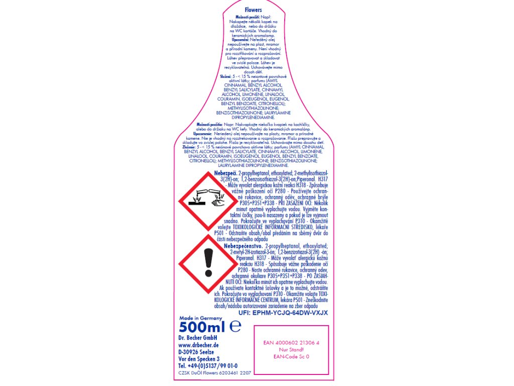 | Upozornění o nebezpečnosti: | Varování: Způsobuje vážné podráždění očí. Uchovávejte mimo dosah dětí. PŘI ZASAŽENÍ OČÍ: Několik minut opatrně vyplachujte vodou. Vyjměte kontaktní čočky, jsou-li nasazeny. Pokračujte ve vyplachování. Je-li nutná lékařská pomoc, mějte po ruce obal nebo štítek výrobku. Přetrvává-li podráždění očí: Vyhledejte lékařskou pomoc/ošetření. |