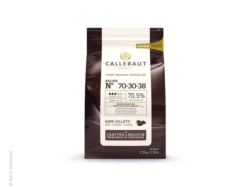 Extra hořká čokoláda Callebaut 70-30-38NV s obsahem kakaa 70,5 % dodávaná ve formě drobných peciček (callets), které jsou balené v sáčcích po 2,5 kg