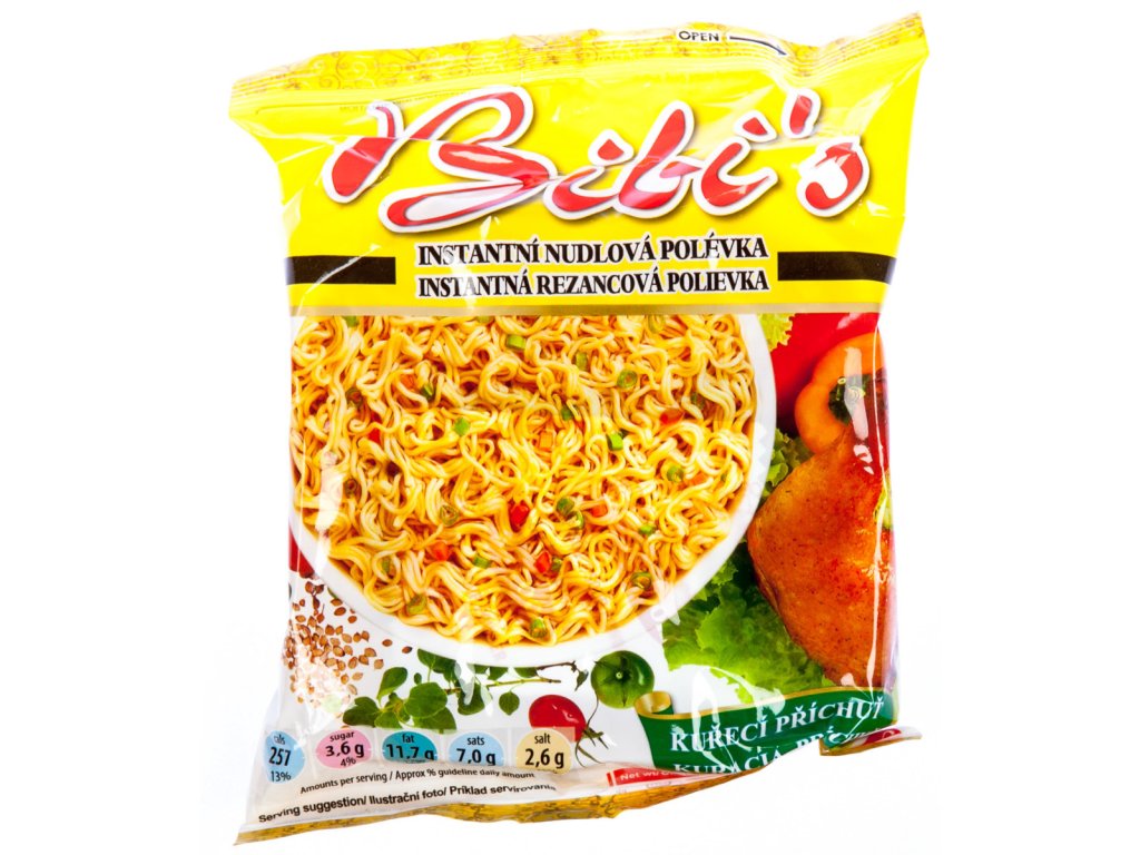 - nudle (90.9%): pšeničná mouka, částečně ztužený rostlinný palmový olej, škrob,sůl, stabilizátor Trifosforečnan (E 451i), kypřící látka Uhličitan draselný(E 501), uhličitan sodný (E500), antioxidant Butylhydroxyanisol (E 320),antioxodant Butylhydroxytoluen (E 321).Koření (9,1%): sůl, rostlinný palmovýolej,cukr, látka zvýrazňující chuť a vůni Glutamát sodný (E 621), látkazvýrazňující chuť a vůni Inosinát sodný (E 631), látka zvýrazňující chuť a vůniGuanylát sodný (E 627), antioxidant Butylhydroxyanisol (E 320), antioxodantButylhydroxytoluen (E 321), koření, umělá kuřecí příchuť 0.1%, sušený celer