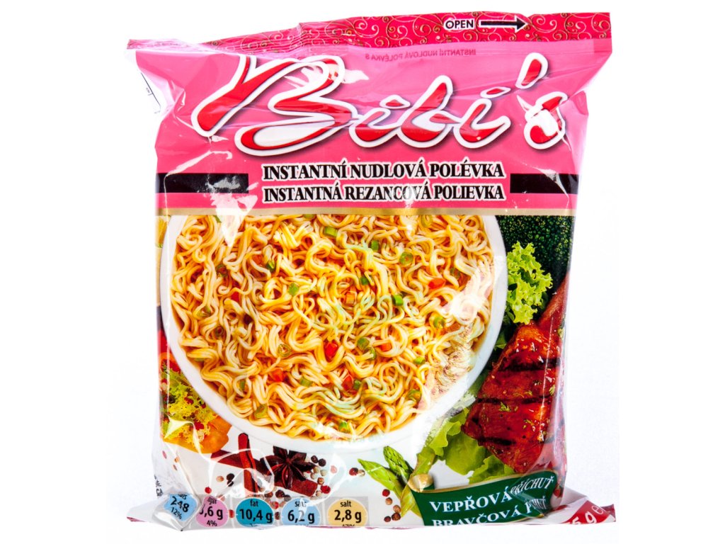 - nudle (90.1%): pšeničná mouka, částečně ztužený rostlinný palmový olej, škrob,sůl, stabilizátor Trifosforečnan (E 451i), kypřící látka Uhličitan draselný(E 501), uhličitan sodný (E500), antioxidant Butylhydroxyanisol (E 320),antioxodant Butylhydroxytoluen (E 321).Koření (9,9%): sůl, cukr,rostlinnýpalmový olej,cukr, látka zvýrazňující chuť a vůni Glutamát sodný (E 621), látkazvýrazňující chuť a vůni Inosinát sodný (E 631), látka zvýrazňující chuť a vůniGuanylát sodný (E 627), antioxidant Butylhydroxyanisol (E 320), antioxodantButylhydroxytoluen (E 321), koření, přírodní kouřová příchuť, sušená jarnícibulka, umělá vepřová příchuť 0.002% (ječmen, sojový bob)