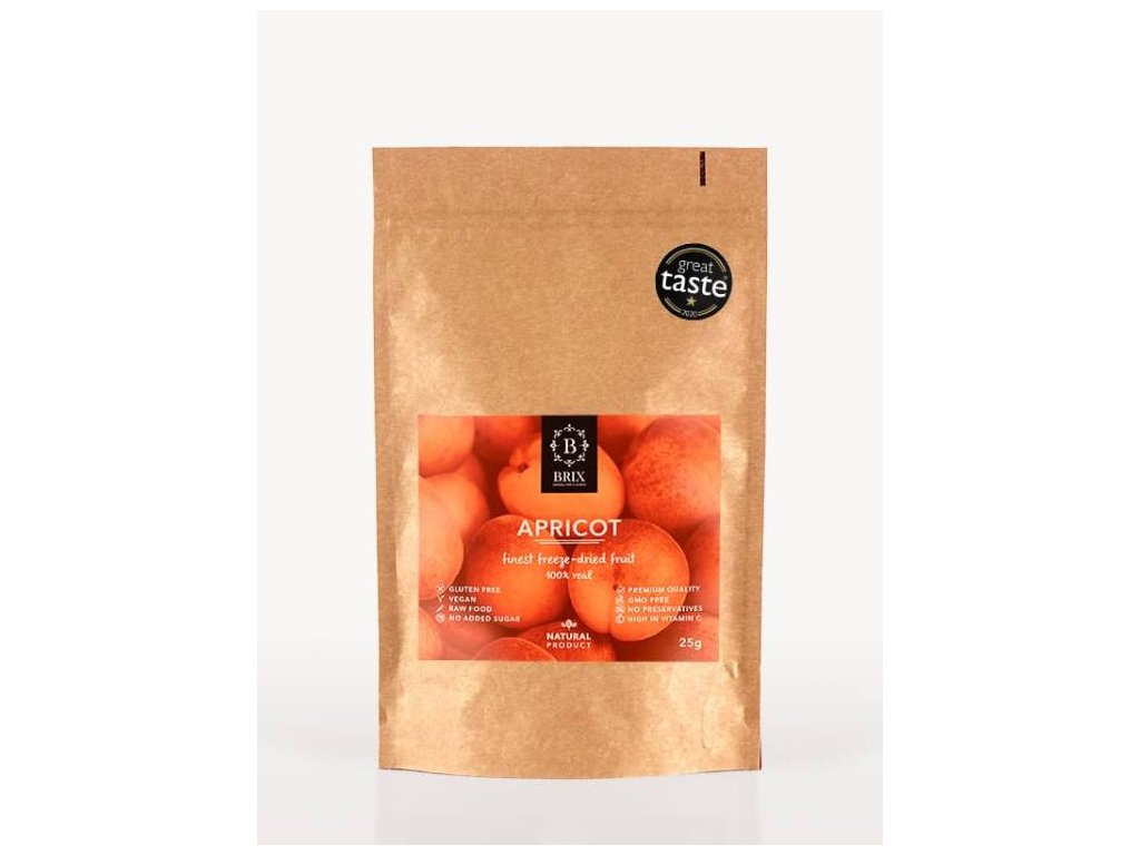 Ovoce sušené mrazem je 100% čisté ovoce, ze kterého je odstraněna voda. Je křupavě vysušeno, zachovává si barvu, chuť a až 98% výživových hodnot, takže je téměř identické s původním ovocem. Je bez konzervantů. Může být rehydrováno nebo konzumováno přímo. Ideální do müsli, jogurtů, sorbetů, smoothies, pro kulinářské speciality a pečení. Vyrobené z 250 g čerstvého ovovce. Složení: 100% meruňky dehydrované procesem lyofilizace (proces sušení mrazem) Nutriční hodnoty ve 100 g: energie 1608 kJ/383 kcal, tuky 0,64 g (z toho nasycené 0,19 g), sacharidy 87,3 g (z toho cukry 59,8 g), vláknina 5,9 g, bílkoviny 5,97 g, sůl <0,01 gDoplňkové parametry