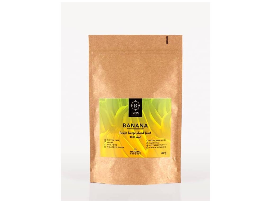 Ovoce sušené mrazem je 100% čisté ovoce, ze kterého je odstraněna voda. Je křupavě vysušeno, zachovává si barvu, chuť a až 98% výživových hodnot, takže je téměř identické s původním ovocem. Je bez konzervantů. Může být rehydrováno nebo konzumováno přímo. Ideální do müsli, jogurtů, sorbetů, smoothies, pro kulinářské speciality a pečení. Vyrobené z 400 g čerstvého ovovce. Složení: 100% banán dehydrovaný procesem lyofilizace (proces sušení mrazem) Nutriční hodnoty ve 100 g: energie 1452 kJ/347 kcal, tuky 0,8 g (z toho nasycené 0,01 g), sacharidy 83,6 g (z toho cukry 63 g), vláknina 8 g, bílkoviny 5,3 g, sůl <0,01 gDoplňkové parametry