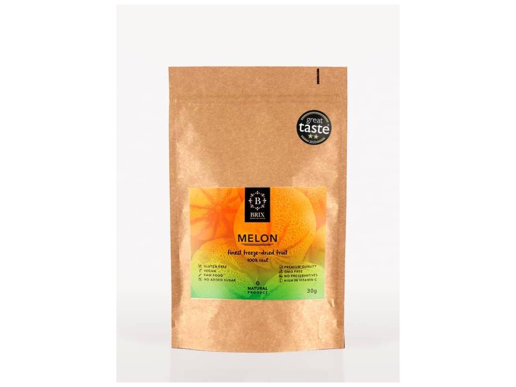 Ovoce sušené mrazem je 100% čisté ovoce, ze kterého je odstraněna voda. Je křupavě vysušeno, zachovává si barvu, chuť a až 98% výživových hodnot, takže je téměř identické s původním ovocem. Je bez konzervantů. Může být rehydrováno nebo konzumováno přímo. Ideální do müsli, jogurtů, sorbetů, smoothies, pro kulinářské speciality a pečení. Vyrobené z 300 g čerstvého ovovce. Složení: 100% meloun dehydrovaný procesem lyofilizace (proces sušení mrazem) Nutriční hodnoty ve 100 g: energie 1335 kJ/319 kcal, tuky 0,9 g (z toho nasycené 0,01 g), sacharidy 74,2 g (z toho cukry 59 g), vláknina 8,1 g, bílkoviny 4,7 g, sůl <0,01 gDoplňkové parametry