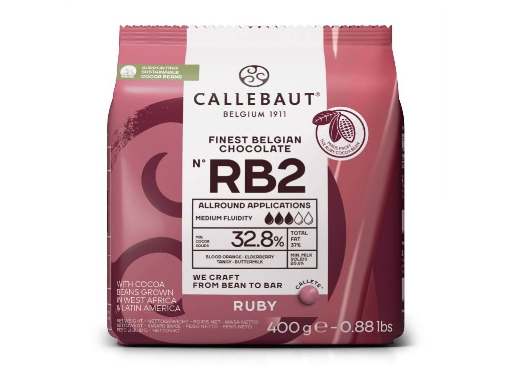 Po hořké, mléčné a bílé čokoládě je ruby čokoláda nejporozuhodnější objev za posledních 80 let. Oslnivý zázrak matky přírody, který přináší naprosto nový chuťový zážitek a unikátní barvu. Zrozen z rubínového kakaového bobu, bez přidaných barviv, bez přidaných ovocných příchutí. Ruby RB2 posouvá požitek na novou úroveň. To vše díky intenzivnější, ovocnější chuti a štiplavými, kyselými tóny než kterákoli ruby čokoláda před ní. Ruby RB2 má rovněž intenzivnější, jiskřivější barvu. Doporučujeme používat ruby ??RB2 co nejvíce v její čisté podobě, ale díky tekutosti (značeno 3 kapkami) je vhodná pro širokou škálu aplikací. Složení: cukr, kakaové máslo, sušené odstředěné mléko, kakaová hmota, regulátor kyselosti kyslina citronová, emulgátor sójový lecitin Obsah kakaové sušiny min. 32,8%. Nutriční hodnoty ve 100 g: energie 2377 kJ/568 kcal, tuky 37 g (z toho nasycené 22 g), sacharidy 51 g (z toho cukry 51 g), bílkoviny 6,3 g, sůl 0,2 gDoplňkové parametry