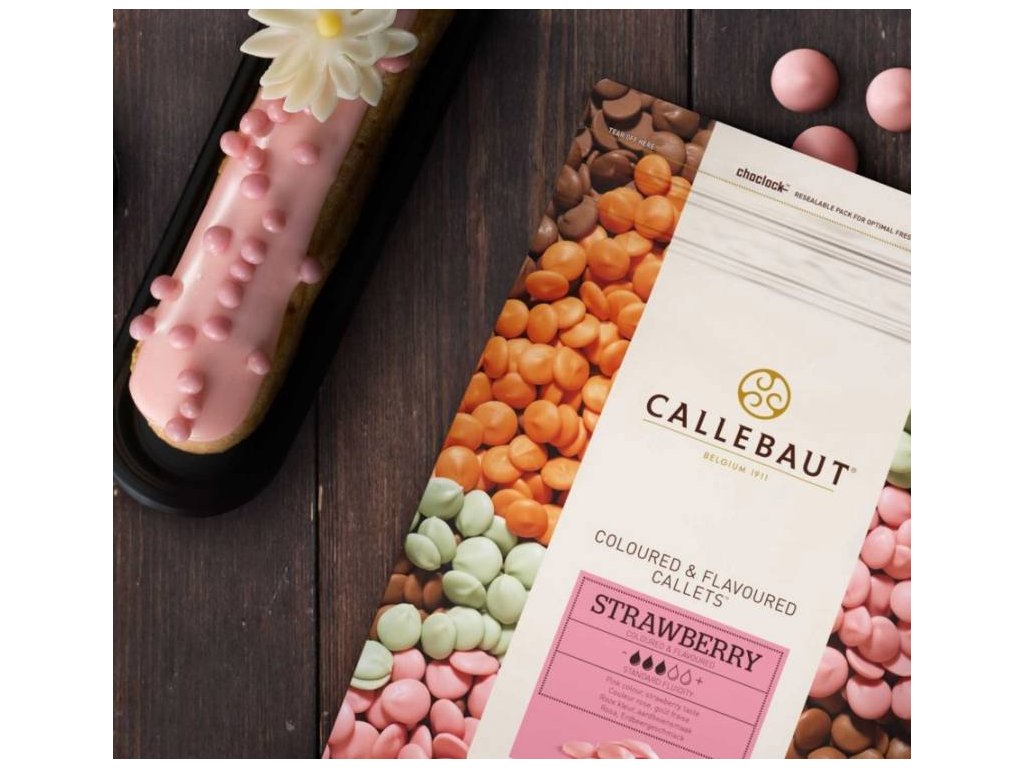 Jahodově zbarvená a ochucená bílá čokoláda. Řekni to růžovou. Obarvěte a dochuťte své dezerty pomocí Strawberry Callets™. Vyrobené z belgické bílé čokolády Callebaut®, kombinuje smetanovou a karamelovou sladkost se zřejmou jahodovou příchutí. S jejich standardní tekutostí můžete Strawberry Callets™ použít pro stejný široký rozsah použití, jako tradiční čokolády Callebaut. Jsou vynikající pro doplnění barevných detailů odlitkům čokolády a pralinkám nebo pro vytváření barevných ozdob koláčů a dezertů. Navíc jsou vynikající pro dochucování krémů, pěn a náplní cukroví jahodovým šmrncem. Tavení, temperování a chlazení probíhá přesně stejně, jako tradičních bílých čokolád Callebaut.