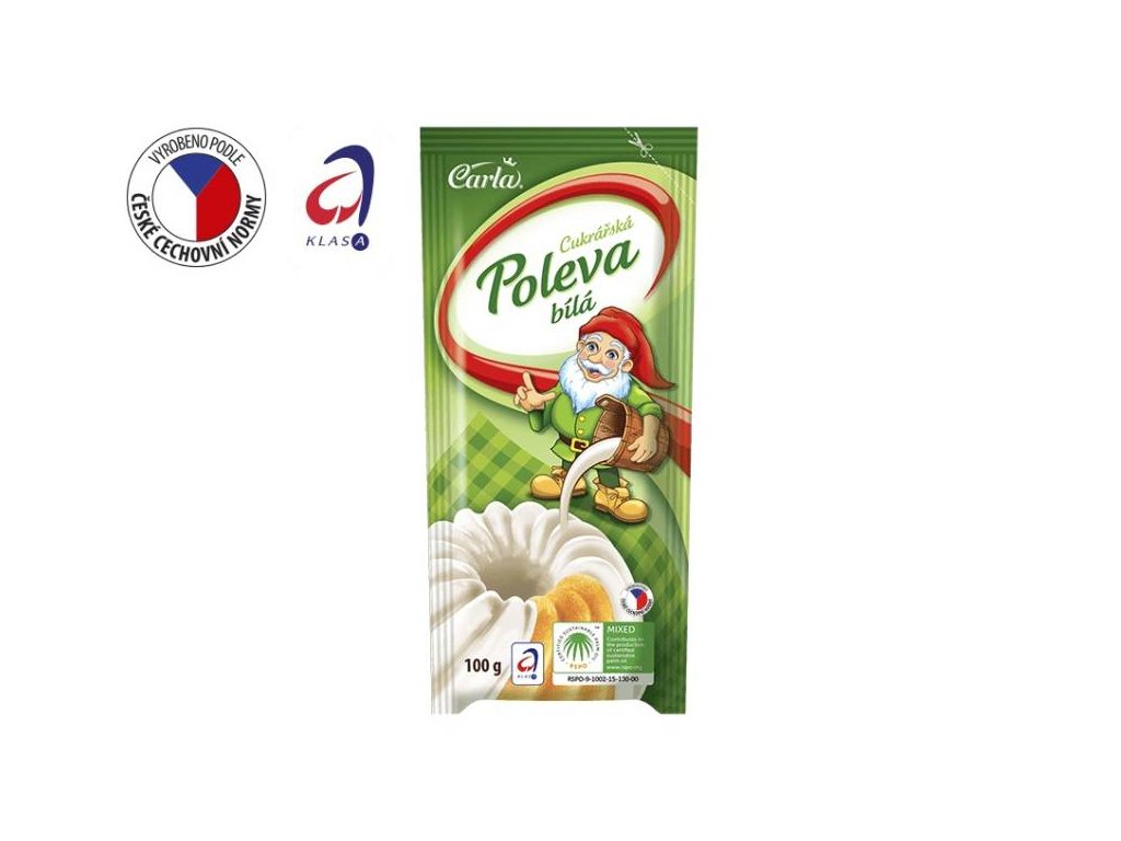 Jemná hotová cukrářská poleva bílá je vhodná k polévání pekařských a cukrářských výrobků, zdobení nebo formování. Použití: Sáček vložíme na 7 minut do horké vody 50°C - 60°C, po rozehřátí vyjmeme a otevřeme. Pečivo poléváme, případně polevu roztíráme nožem nebo stěrkou, poté necháme ztuhnout při pokojové teplotě nebo v lednici. Pro lepší krájení výrobku s polevou použijeme nůž nahřátý v horké vodě. Složení: cukr, plně ztužený rostlinný tuk (palmojádrový - certifikovaný tuk z trvale udržitelných zdrojů), sušené mléko odstředěné, sušená syrovátka, emulgátory (sójový lecitin, polyglycerol-polyricin-oleát), regulátor chuti (kyselina citronová), jedlá sůl, aroma Nutriční hodnoty ve 100 g: energie 2451 kJ/588 kcal, tuky 40 g (z toho nasycené 39 g), sacharidy 54 g (z toho cukry 54 g), bílkoviny 4,2 g, sůl 0,3 gDoplňkové parametry