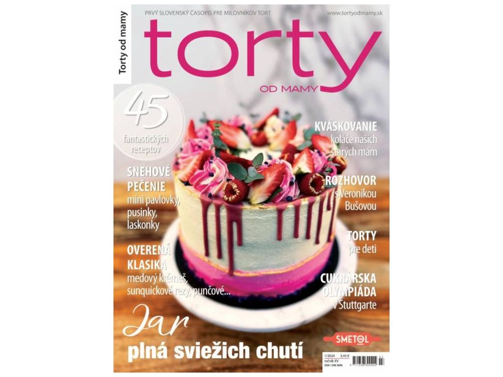 První slovenský časopis pro milovníky dortů. Pomůže Vám zorientovat se v cukrářských pomůckách, polotovarech a nejnovějších trendech, najdete v něm mnoho podrobných fotopostupů, inspirací ze světa, ale také recepty.Všechno na nádherných barevných fotografiích a kvalitním papíru.Vychází čtvrtletně.Doplňkové parametry