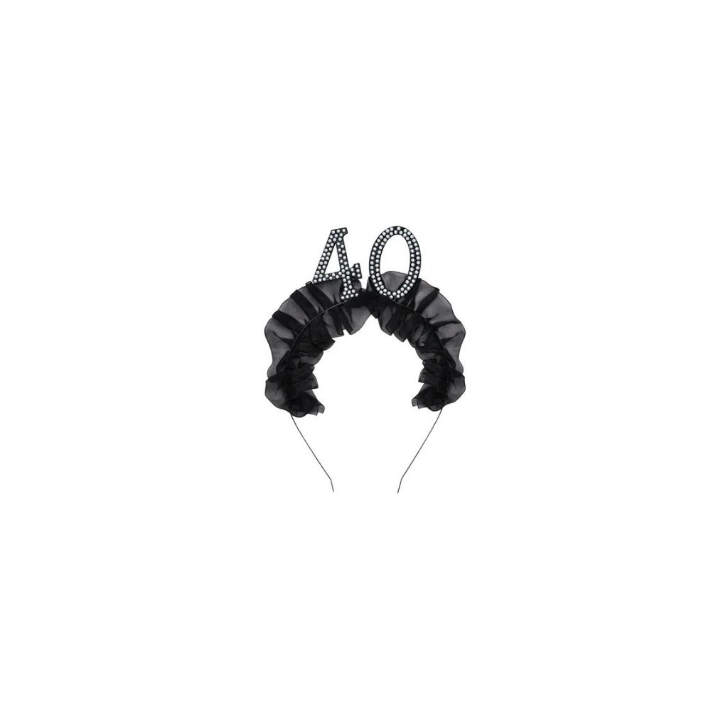 Čelenka s černým látkovým volánem a číslicí 40, zdobená perličkami. Určitě jí využijete jako doplněk při oslavě narozenin, nebo do narozeninového fotokoutku. Celkový rozměr je cca 12 x 19,5 cm. Výška samotného čísla cca 5,3 cm. Rozměr: cca 12 x 19,5 cmMateriál: Kov, plast, polyesterBalení: 1 ksObchodní balení: AnoDoplňkové parametry