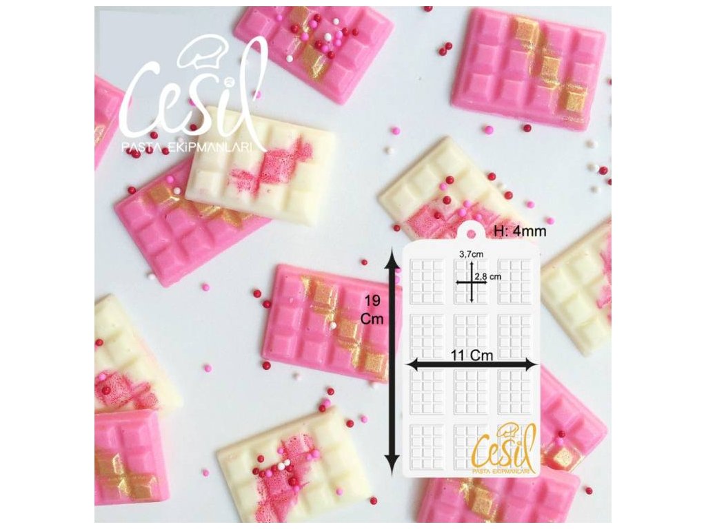 Kvalitní silikonová forma na výrobu čokoládových pralinek. Rozměr formy: cca 19 x 11 cm Rozměr jedné tabulky 3,7 x 2,8 cm Použití: Do formy nalijte rozpuštěnou čokoládu a nechte v lednici ztuhnout. Lze použít i na fondánovou hmotu, isomalt a želatinu.Doplňkové parametry