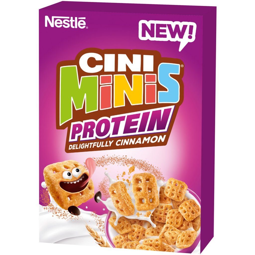 - Nestlé Cini Minis Protein - Snídaňové cereálie ve tvaru vaflí se skořicí, s vitamíny a železem, zdroj bílkovin. Extrudovaný výrobek.