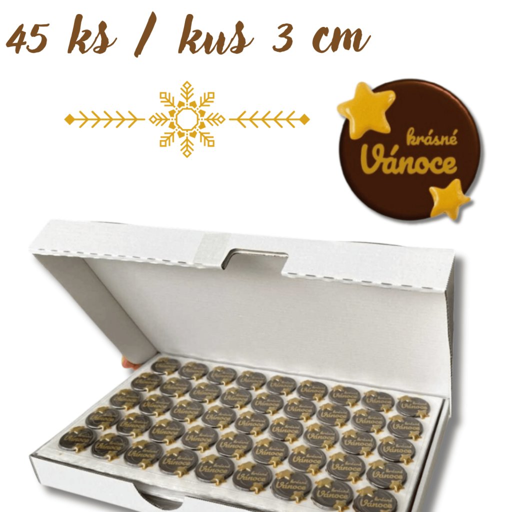 Čokoládová ozdoba na cukroví | mléčná 45 ks - Krásné Vánoce Motiv: vánoční dárky a nápis Krásné Vánoce