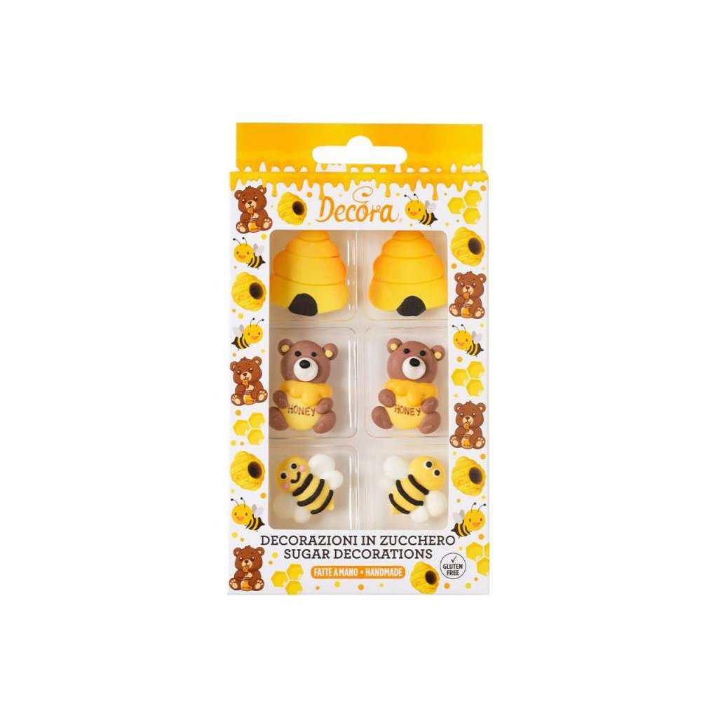 Roztomilé cukrové dekorace Decora – Med (6 ks) ve tvaru včeliček, medvídků a úlů. Ručně vyráběné, barevné, bez lepku – ideální na dorty, muffiny i sušenky.Doplňkové parametry