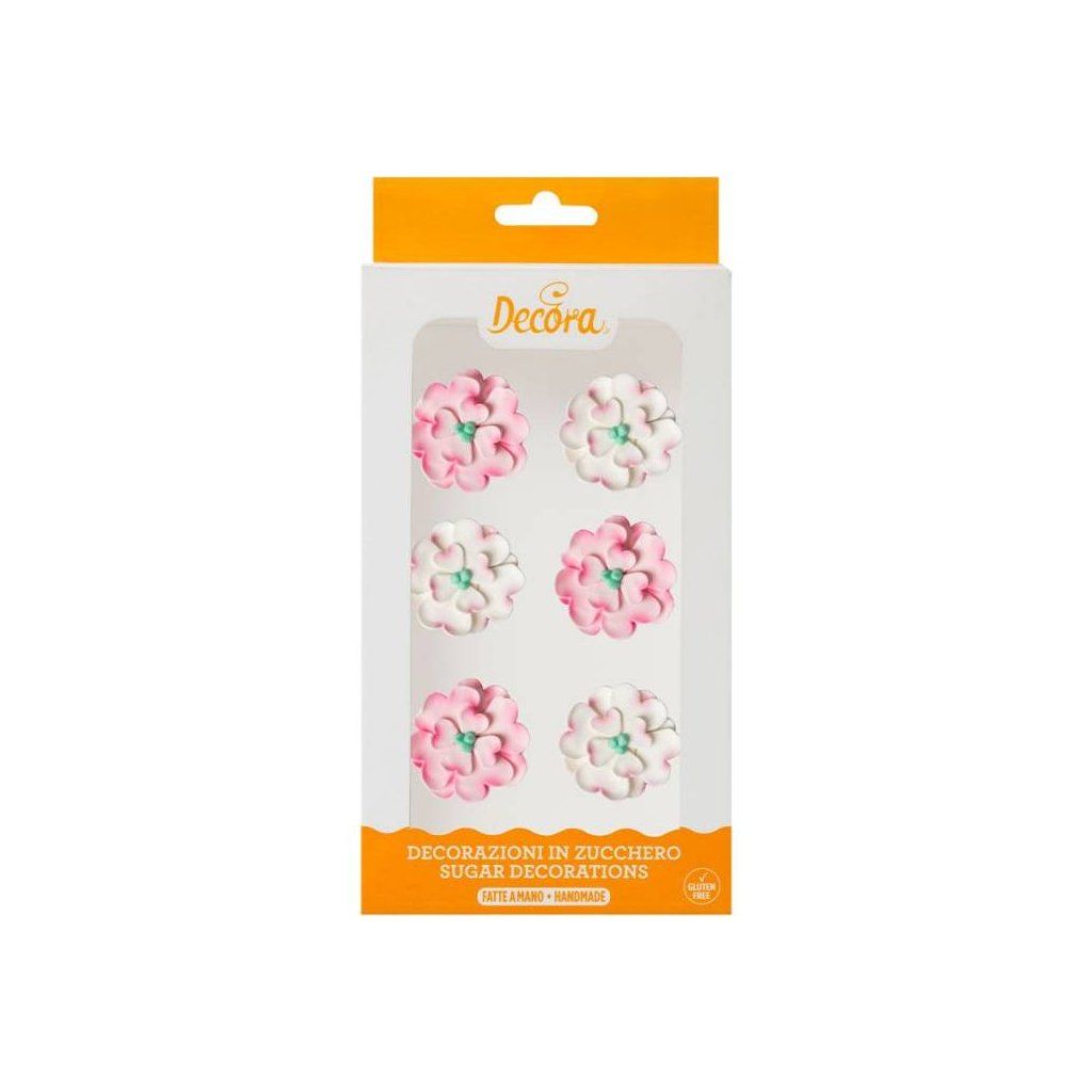 Cukrářské potřeby a suroviny pro sladké pečení.Produkt pro domácí cukráře: Cukrové dekorace bílo růžové kytičky, 6ks - Decora ,