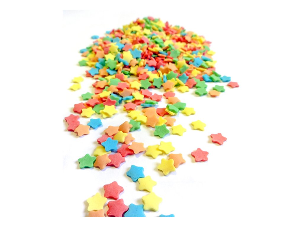 Cukrové pestrobarevné hvězdičky. Používají se na dekoraci dortů a zmrzlinových pohárů.