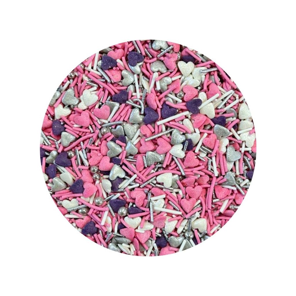 Cukrové zdobení bílé, stříbrné, růžové a fialové Tender Heart (70 g) ▹