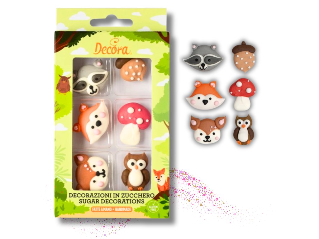 Cukrové zdobení na dort lesní zvířátka připravené k přímému použití. Zdobení je vyráběno ručně, s obsahem přírodních extrakčních barviv. Ideální pro zdobení dortů, košíčků a dalších dezertů.