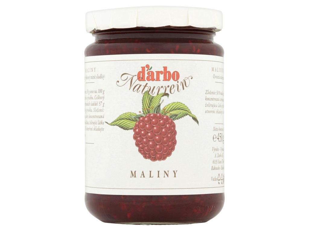 - Vyrobeno z 50 g ovoce na 100 g konečného výrobku. Celkový obsah přírodních sladidel 57 g ve 100 g výrobku. Složení: maliny, cukr, koncentrovaná citrónová šťáva, želírující látka pektin