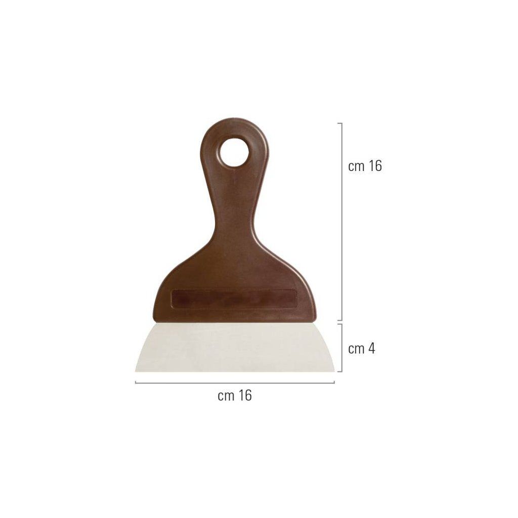 Víceúčelová špachtle s ergonomickou plastovou rukojetí a čepelí z nerezové oceli, ideální pro řezání, drcení, škrábání a sbírání surovin z pracovní desky. Vhodné pro zpracování čokolády.