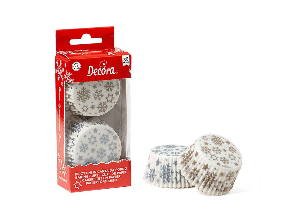 Decora košíčky na muffiny Bílé se stříbrnými a zlatými vločkami (36 ks) ▹