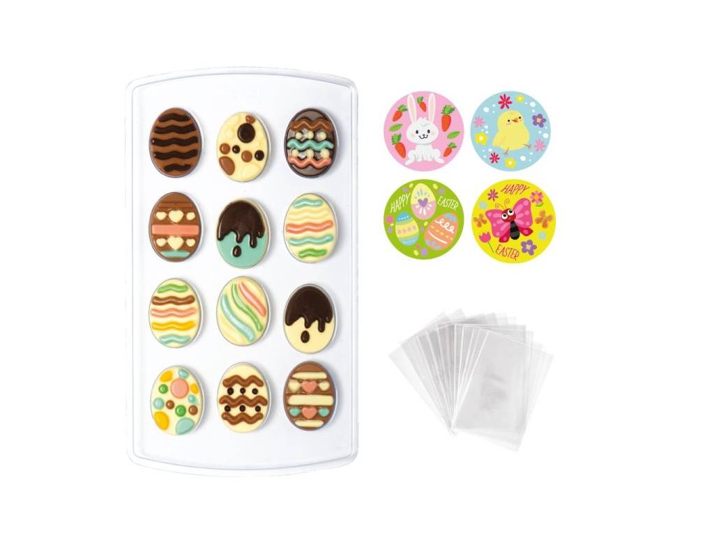 Decora plastová forma na čokoládu Vajíčka se sáčky a nálepkami ▹