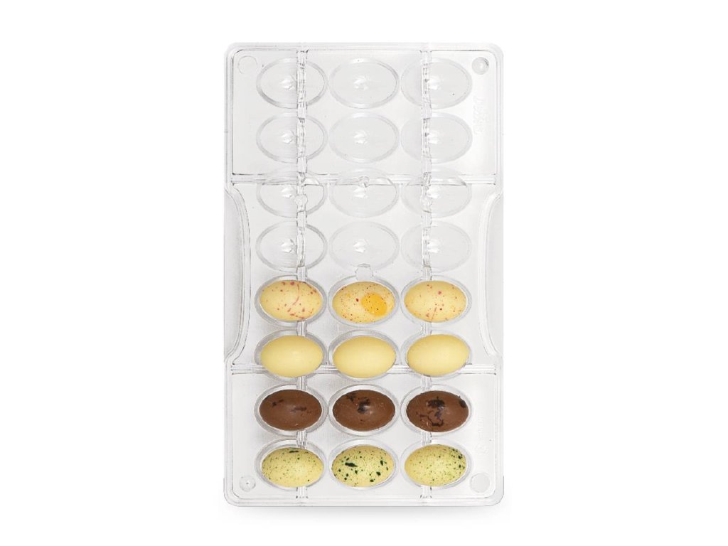 Rozměr formy: 20 x 12 x 2,2 cm Rozměr vajíček: 2,4 cm Materiál: polykrabonát Výroba čokoládových bonbonů je velice jednoduchá. Při výrobě plných čokolád nalijeme do formy čokoládovou hmotu, povrch srovnáme cukrářskou kartou a necháme ztuhnout. Pokud chceme vyrábět plněné bonbony, musíme nejdříve vyrobit tzv. skořápku, to představuje nanesení čokolády na boky tvarovné formy, dáme do mrazáku podchladit a pokud je vrstva tenčí, naneseme vrstvu druhou. Do vytvořené skořepiny vkládáme požadovanou náplň - marcipán, alkoholové náplně, oříškové nebo karamelové. Záleží jen na naší fantazii a chuti. Při plnění skořepiny nezapomeneme na ponechání prostoru na zavíčkování bonbonu – tj. zalití náplně další vrstvičkou čokolády. Formu opět vkládáme do chladu a po vytuhnutí vyklepneme.Doplňkové parametry