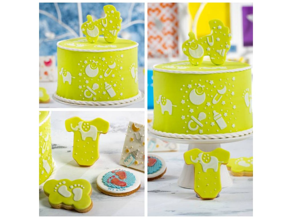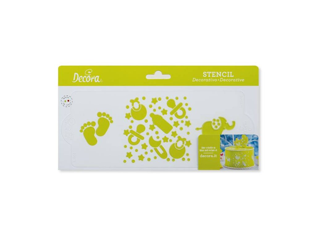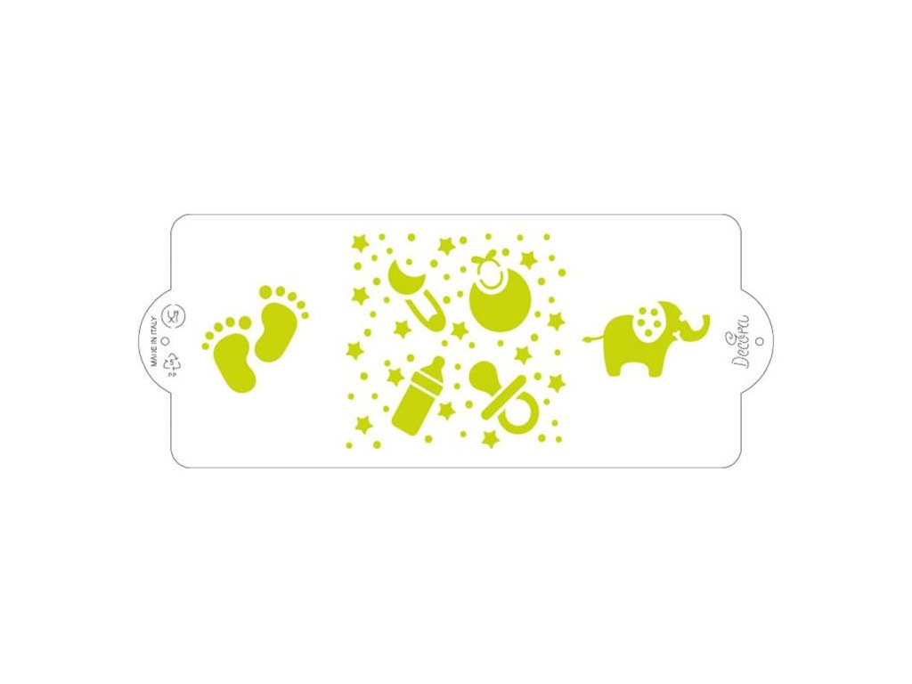 Rozměr: 10 x 25 cm Použití: Stencilu přiložíme na potahovací hmotu a přetřeme ji buď polevou Royal icing nebo prachovou barvou. Též lze použít nástřik pomocí sady Airbrush nebo barvy ve spreji. Při aplikaci nesmíme šablonou pohnout. Pak ji z hmoty sundáme.Doplňkové parametry