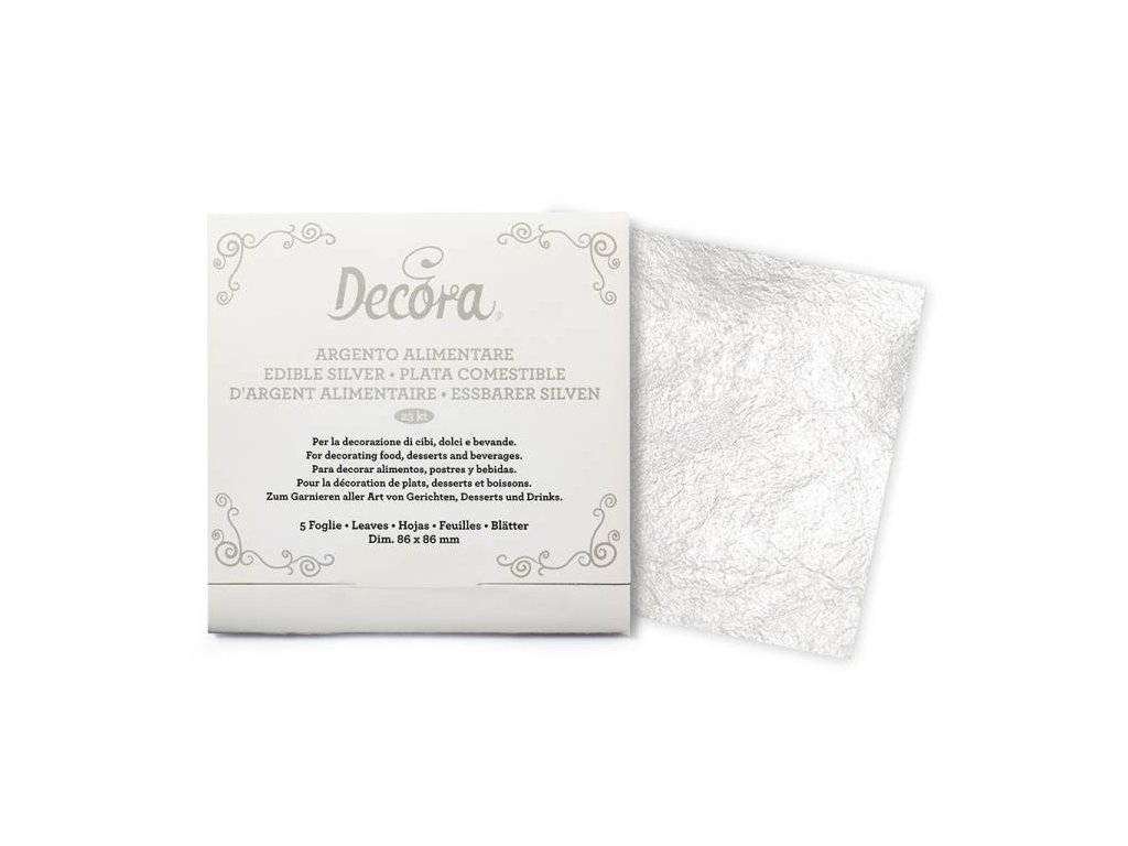 Transfer plát stříbrný Rozměry: 8,6 x 8,6 cm Návod k použití: Nůžkami vystřihneme požadovaný tvar. Potřeme fondán jedlým lepidlem nebo cukrářskou polevou. Plátek umístíme přesně na požadované místo (nelze odstranit) a jemně stiskněte. Necháme schnout 1 minutu a pak sloupneme přenosový papír pinzetou. Jako potravinářská přídavná látka se používá výhradně pro povrchovou výzdobu, na čokoládu, cukrovinkyDoplňkové parametry
