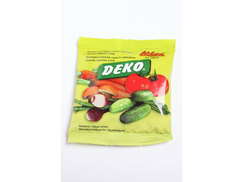 - Smícháme 1,75 l vody, 0,5 l octa 8 %, 100 – 120 g cukru (možno nahradit umělým sladidlem) a obsah sáčku DEKO®, 5 MINUT POVAŘÍME A ZCHLADÍME. Do sklenic vložíme 2 kg okurek (možno proložit kolečky mrkve a cibulky), zalijeme nálevem, uzavřeme a skladujeme v chladu. Obdobně nakládáme houby, rajská jablíčka a všechny druhy zeleniny. Houby, květák a cibulku je třeba předem povařit ve slané vodě.