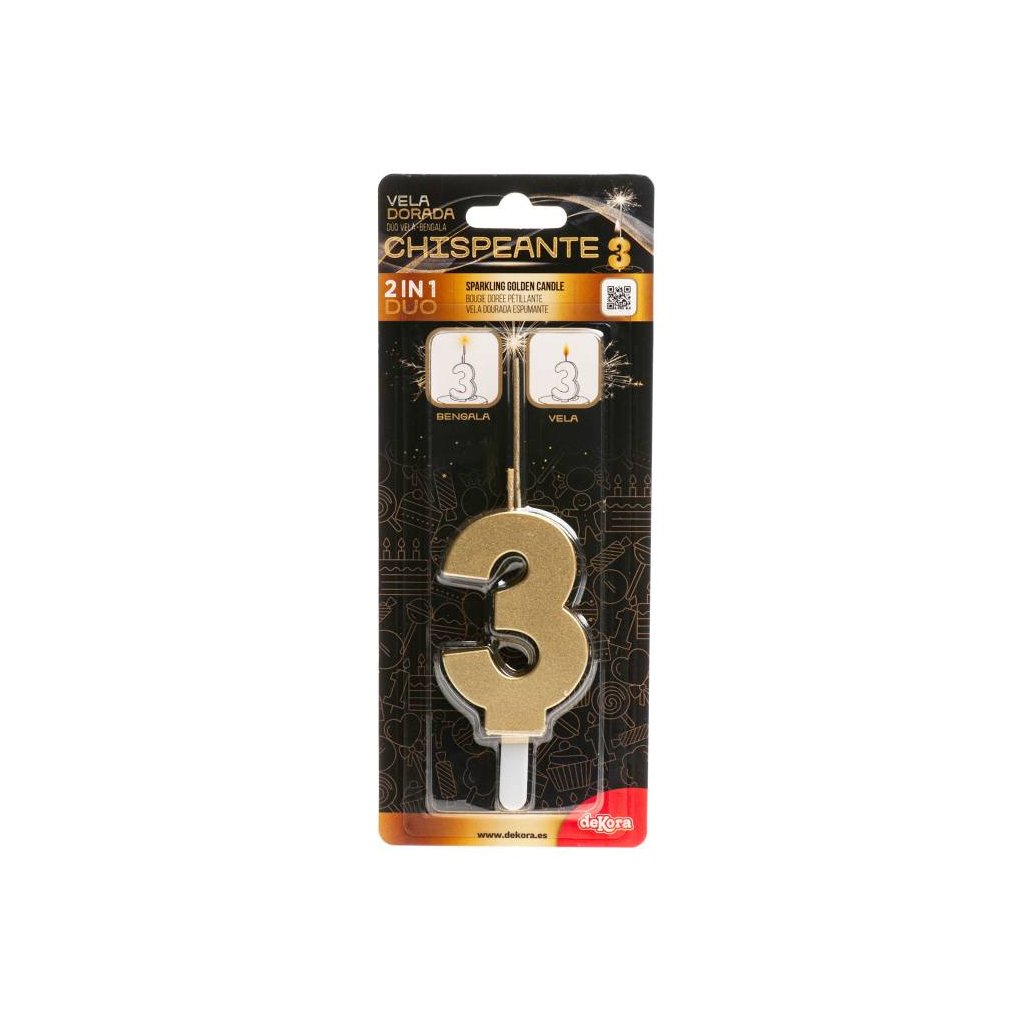 Dekora svíčka s prskavkou zlatá číslo 3 ▹