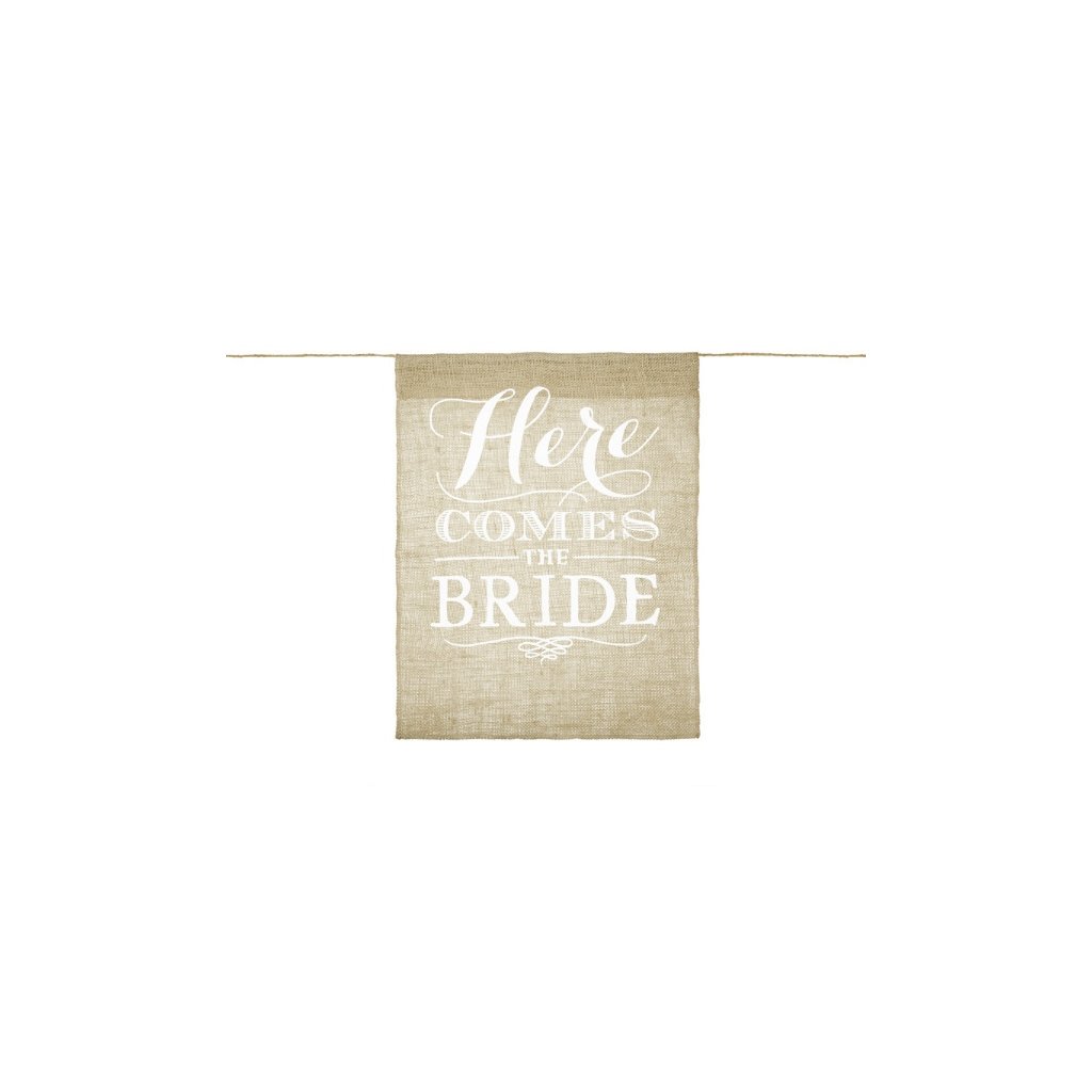 Stylová dekorace z juty s nápisem Here comes the Bride. Vhodná na jakoukoliv svatbu ale i rozlučku se svobodou. Tímto jednoduchým party doplňkem, dotáhnete každou oslavu k dokonalosti. Velikost: 41 x 51 cm. Barva: juta a bílá. Balení: 1 ks.Doplňkové parametry