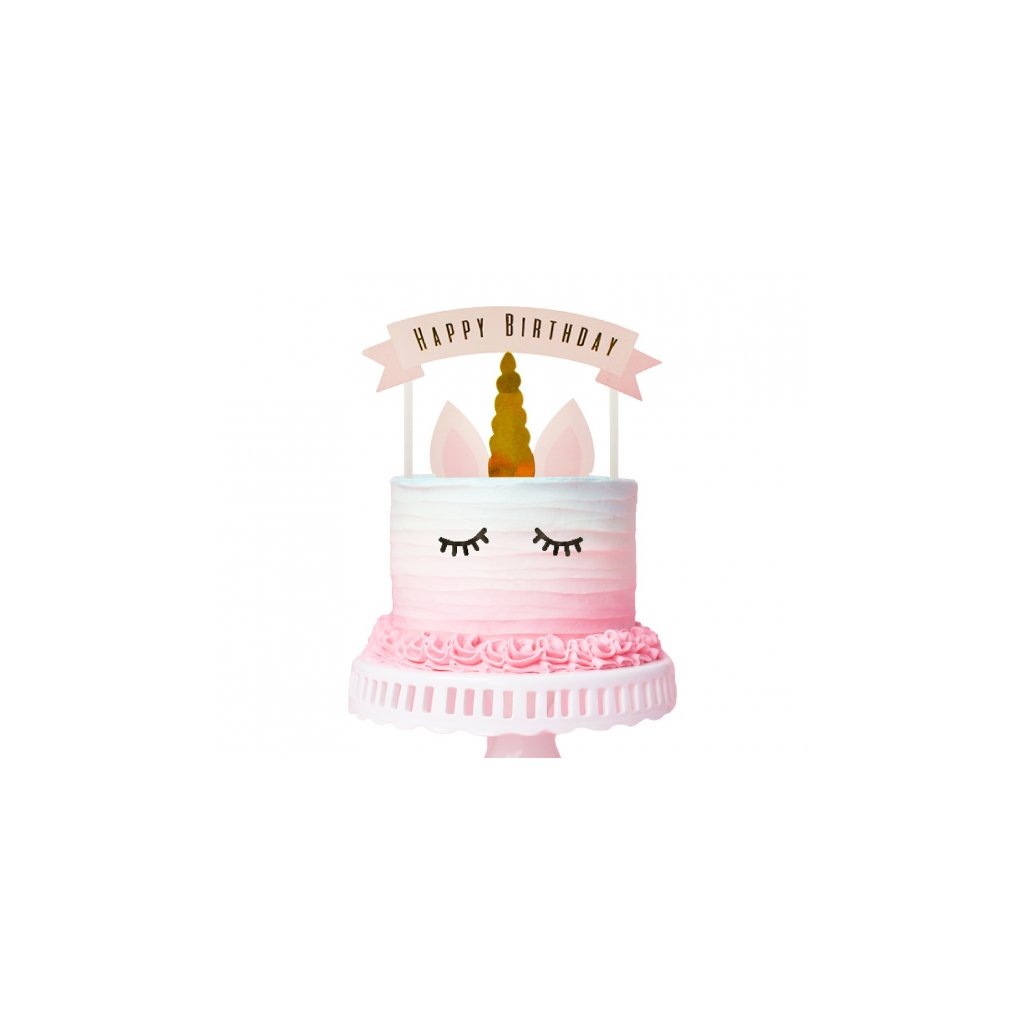 Set dekorací pro výzdobu narozeninového dortu ve stylu jednorožce. Set obsahuje Topr s nápisem Happy Birthday (17x13cm), uši s rohem (14 x 10 cm) líčka (2,5cm) a řasy (5,5 cm). vše obsahuje i zápichy. Balení 6 ks celkem.Doplňkové parametry